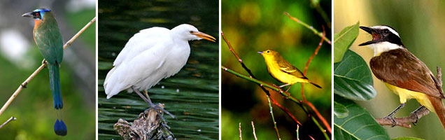 FROM LEFT TO RIGHT, SOME OF THE BIRD SPECIES YOU MAY SEE AT AMATIERRA: BLUE-CROWNED MOTMOT, CATTLE EGRET, YELLOW WARBLER, GREAT KISKADEE.[/vc_column_text][/vc_column][vc_column width=”1/4″][vc_column_text]